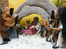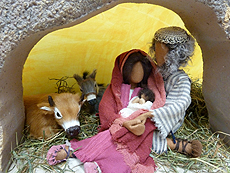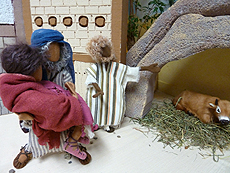 Weil Betlehem überfüllt war, fanden Maria und Josef kein Zimmer, nur einen Platz, wo sich die Tiere aufhielten. |