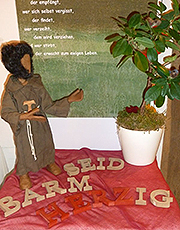 Außerhalb der Stadtmauern Assisis suchte Franziskus immer wieder die Stille, um über sich und sein Leben nachzudenken.Hier lebten auch die Aussätzigen. Einmal rief ihm ein Aussätzige zu: „Erbarmen, Herr! Habt Mitleid mit einem Kranken!" Franziskus war stumm und starr, warf ihm schnell ein paar Münzen hin und lief weg. Doch dann schämte er sich. Er kehrte um und überwandte seinen anfänglichen Ekel. Er zeigte Mitgefühl und aktive Zuwendung: Franz umarmte den Kranken und gab ihm den Friedensgruß... In den Leidenden und Armen begegnete ihm Christus in besonderer Weise. Er orientierte sich nicht mehr ‚nach oben', sondern schaute ‚nach unten' - und begriff: „Das ist der neue Weg für mich!" |