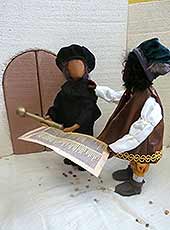 Martin Luther konnte es nicht mehr hinnehmen, dass sich die Bürger Wittenbergs aus Angst von ihren Sünden freikauften.Er wollte wissen, was andere Kirchenmänner über den Ablasshandel dachten und alle zu einem offenen Gespräch einladen. Er wollte nicht länger nur zornig sein, sondern handeln! Die Menschen sollten erfahren, warum der Handel mit Ablassbriefen nicht in Ordnung war. In einer langen Liste schrieb Martin Luther alles auf, was ihn beschäftigte: