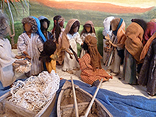 In diesen Tagen war wieder einmal eine große Menschenmenge bei Jesus versammelt. Schließlich hatten die Leute nichts mehr zu essen.Jesus rief seine Jünger zu sich und sagte: „Die Leute tun mir leid. Sie sind jetzt schon drei Tage bei mir und haben nichts mehr zu essen. Ich kann sie doch nicht hungrig wegschicken. Sie würden unterwegs zusammenbrechen, denn einige von ihnen haben es noch weit bis nach Hause!“ Darauf erwiderten die Jünger: „Aber woher soll jemand hier in dieser verlassenen Gegend genügend Brot bekommen, damit sie alle satt werden?“ „Wie viele Brote habt ihr denn?“, wollte Jesus wissen. Sie antworteten: „Sieben!“ Da forderte Jesus die Menschen auf, sich auf den Boden zu setzen. Er nahm die sieben Brote und dankte Gott dafür. Dann teilte er sie und gab sie den Jüngern, die sie an die Leute weiterreichten. Sie hatten auch noch einige kleine Fische bei sich. Wieder dankte Jesus Gott dafür und ließ dann die Fische verteilen. Nachdem sich alle satt gegessen hatten, wurden die Reste eingesammelt: sieben große Körbe voll. Etwa viertausend Menschen hatten an der Mahlzeit teilgenommen. Nach dem Essen verabschiedete Jesus die Leute. Dann stieg er mit seinen Jüngern in ein Boot. (Mk 8,1-10; Mt 15,32-39) |