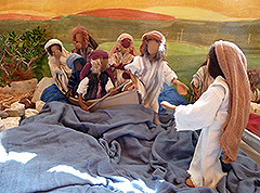 Jesus wollte ein wenig alleine sein und ruderte mit seinen zwölf Jüngern auf dem Boot über den See Gennesaret. Sie blieben in einer einsamen