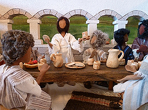 Als alles für das Paschamahl vorbereitet war, kamen Jesus und die Jünger ins Obergeschoss. Jesus segnete das Brot, brach es und sagte: „Nehmt dies und esst es, denn dies ist mein Leib.“ Dann segnete er den Wein und reichte seinen Becher weiter: „Trinkt dies, denn dies ist mein Blut.“ Dann sah Jesus jeden einzelnen Jünger an, das Gesicht voller Sorge. „Einer von euch wird mich verraten.“ Bestürzt fragte einer den anderen: „Wer von uns könnte so etwas tun?“ Da sprang Judas vom Tisch auf, verließ den Raum und rannte in die Dunkelheit hinaus.