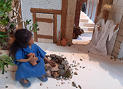 Eines Tages nahm Maria einen Krug, um Wasser zu schöpfen. Eine Stimme sprach zu ihr: „Hab keine Angst, du hast Gnade bei Gott gefunden! Du wirst schwanger werden und einen Sohn