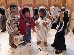 so wie der Engel Gabriel es zu Maria und zu Josef gesagt hatte.Vier Wochen lang konnten sich Mutter und Kind von der Geburt erholen. Dann zogen sie nach Jerusalem, um Gott ihr erstes Kind Gott im Tempel vorstellen. Sie wollten Gott auch ihren Dank darbringen - 2 junge Tauben, so wie es das Gesetz vorschreibt. Im Tempel begegneten sie Simeon, einem alten Mann, der mit Gottes Versprechen lebte: ‚Du sollst nicht sterben, bevor du den Messias, den Gesalbten Gottes, gesehen hast.' Simeon erkannte in dem kleinen Kind Jesus den von Gott versprochenen Messias. Er nahm das Kind in seine Arme und sang ein Loblied für Gott: „Herr, du hast dein Wort gehalten, jetzt kann ich in Frieden sterben. Ich habe es mit eigenen Augen gesehen: Du hast uns Rettung gebracht, die ganze Welt wird es erfahren. Dein Licht erleuchtet alle Völker, und deinem Volk Israel bringt es Größe und Herrlichkeit." Simeon segnete sie. Die 84jährige Prophetin Hanna kam hinzu und lobte Gott und bestätigte alles, was Simeon in seinem Loblied gesagt hatte. Lk 2, 21-40