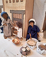 Sie saß auf der Erde und mahlte mit einer Mühle das Getreide, um Mehl zu gewinnen, machte aus dem Mehl einen Teig und backte Brot.